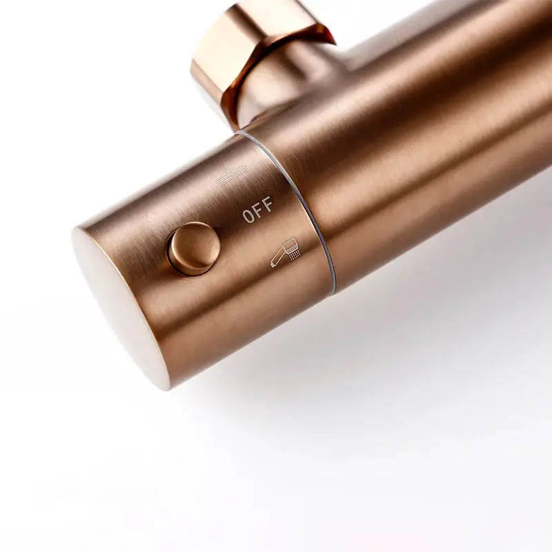 Ce robinet thermostatique, doté d'une finition cuivrée satinée, allie raffinement visuel et précision technique. Son design épuré dissimule une vanne céramique fiable, assurant un contrôle optimal de la température pour une expérience de douche à la fois luxueuse et sécurisée.